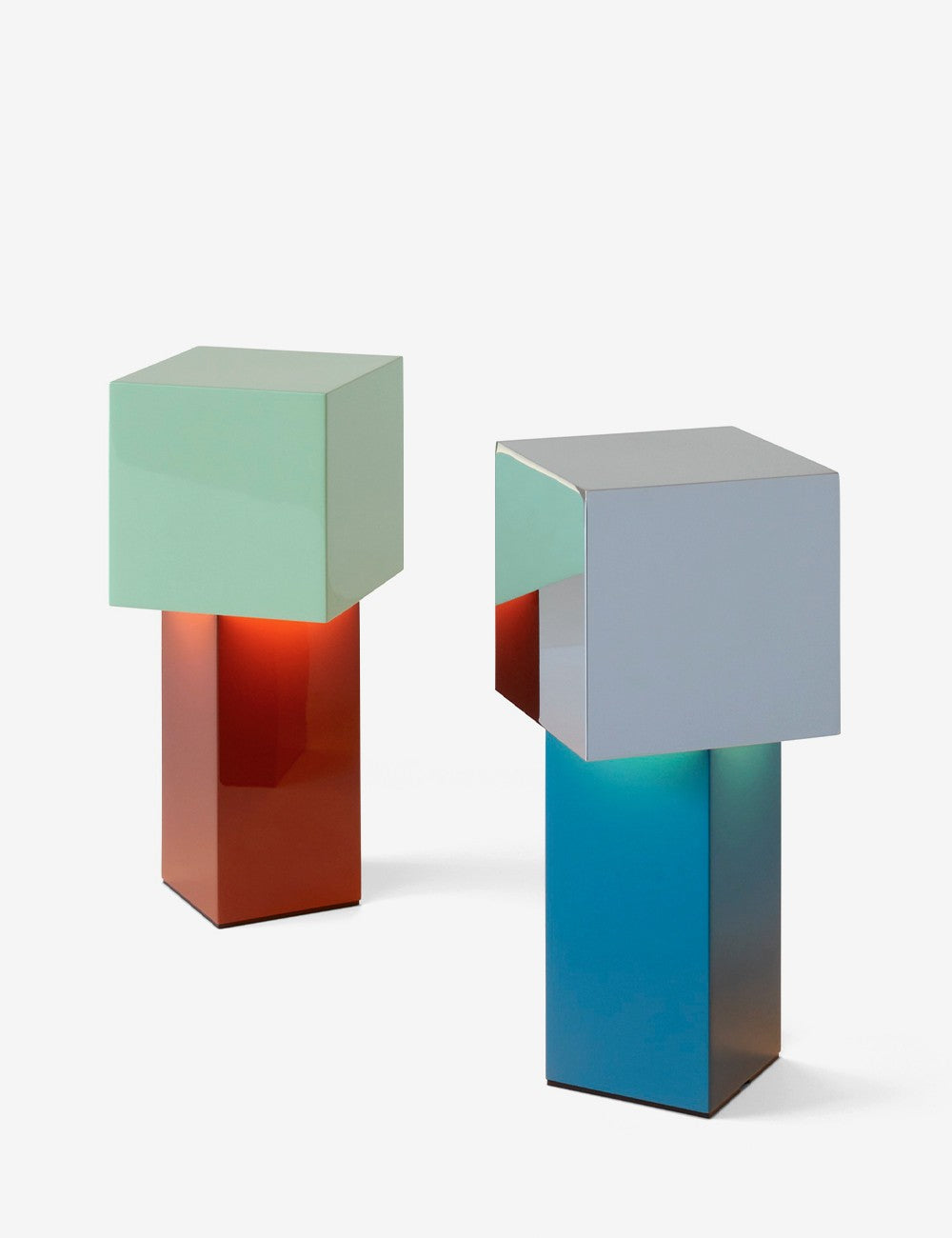 Esta lâmpada escultural brinca entre a luz natural e artificial, a sombra geométrica em um ângulo de 45 graus em relação à base cria uma difusão suave que emula o brilho quente de uma vela moderna.