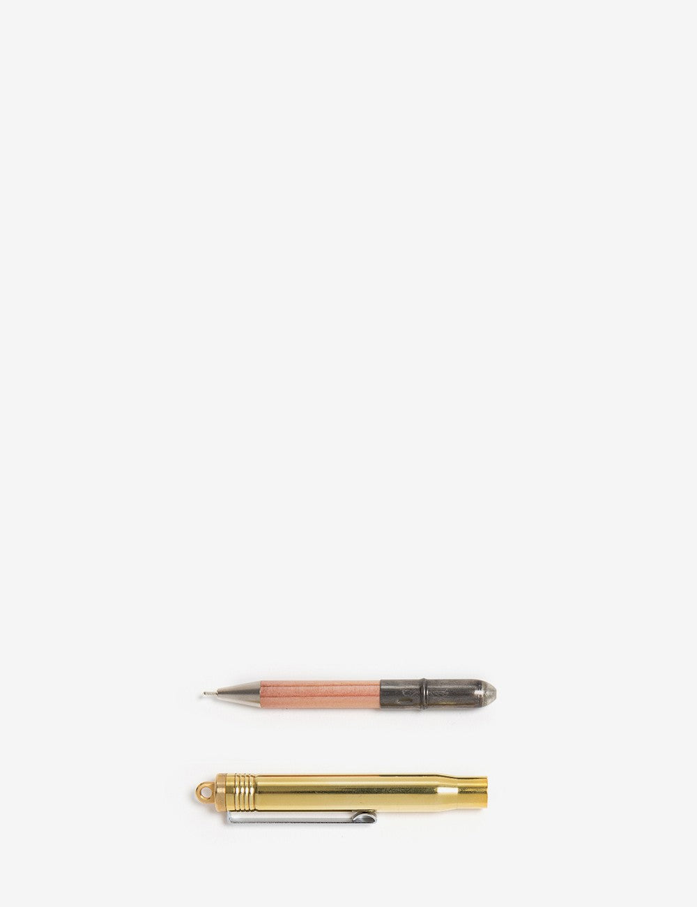 A caneta de latão da Traveler's Company consiste em duas partes: uma caixa de latão, que funciona como uma tampa, e o suporte de caneta de ferro e madeira.