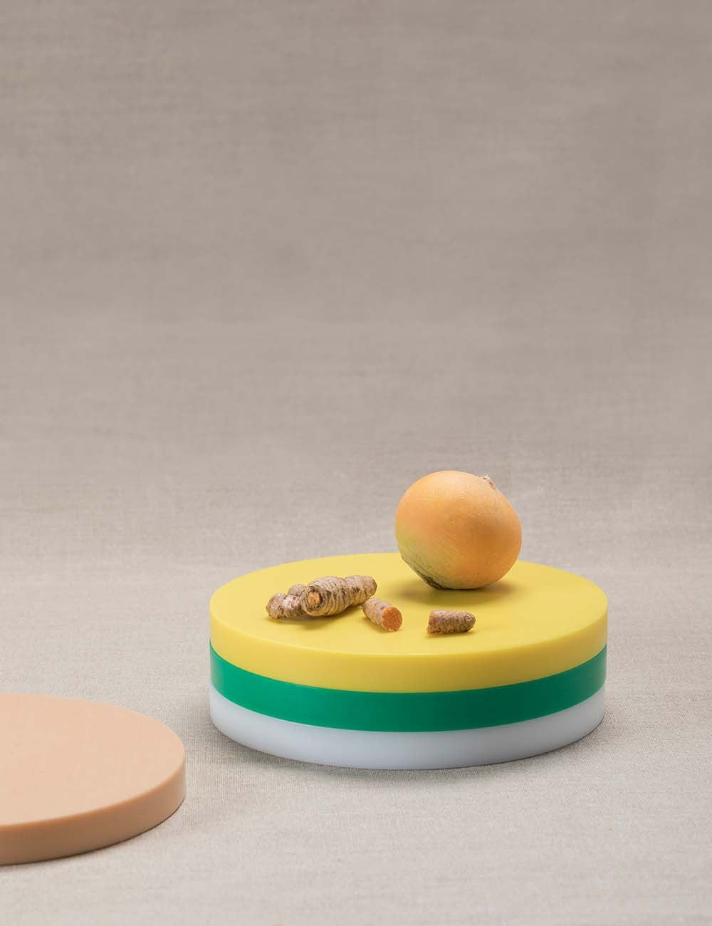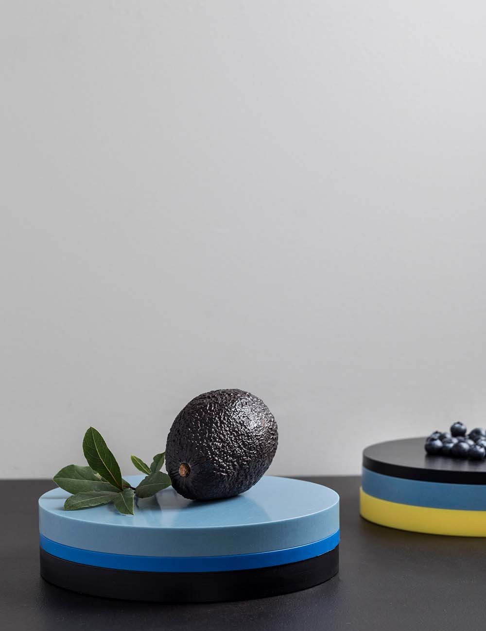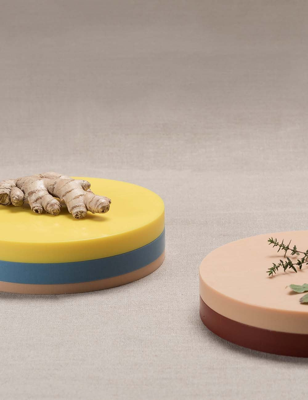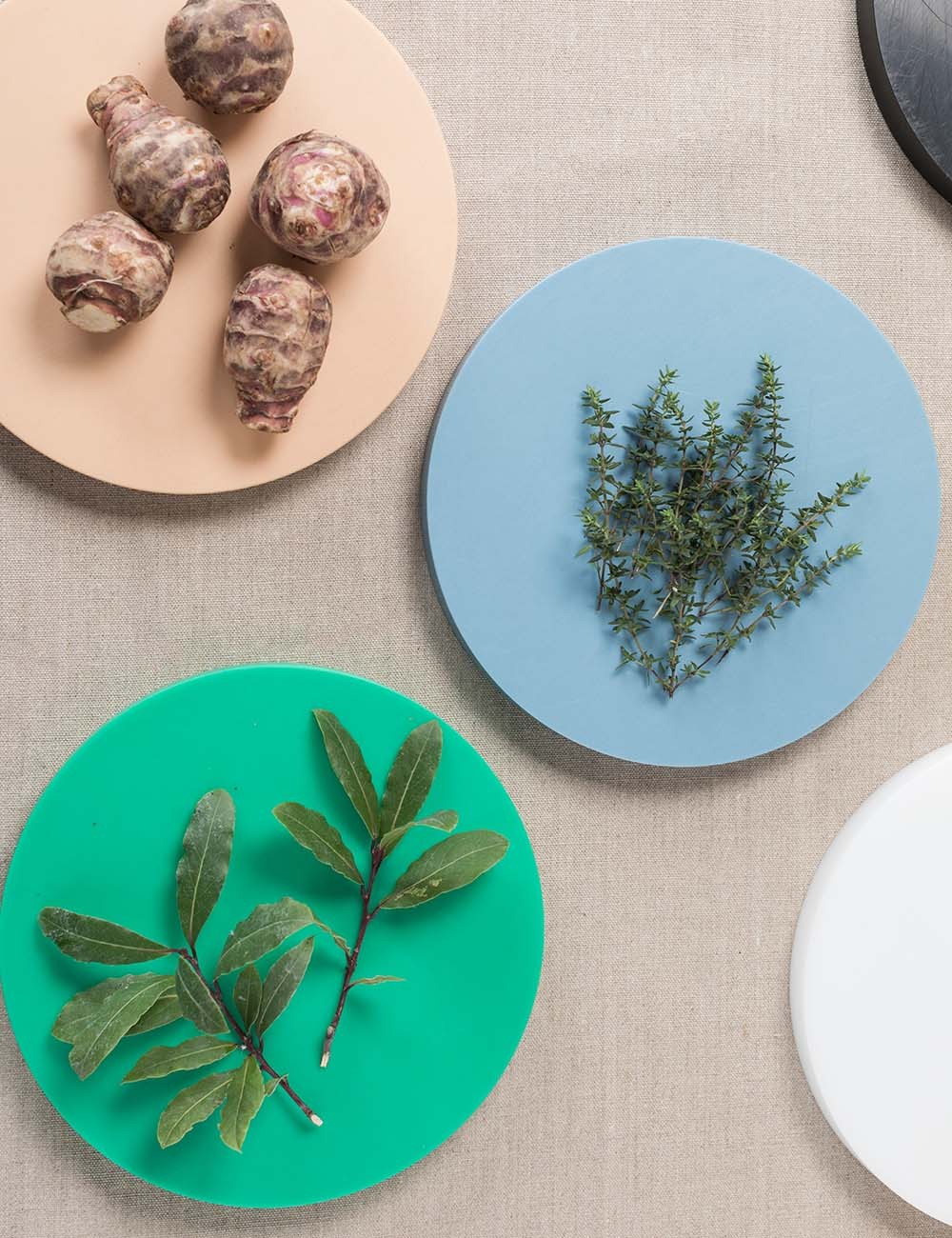 Muller Van Severen concebeu vários conjuntos de cinco objectos em forma de círculo, finamente afinados, para serem utilizados como tabuleiros de comida.
