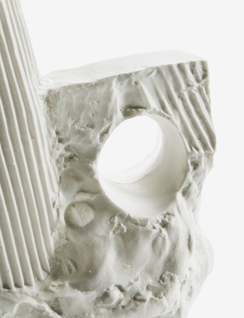 Cada peça mistura a atmosfera da arte antiga com o modernismo, criada através de um processo intuitivo e artesanal que abraça as imperfeições como esculturas erodidas.